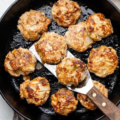 But making them at home is a total game-changer. They are made with fresh ingredients like real chunks of apple, diced onion, ground meat, and a little seasoning. There are no surprise ingredients too, which I’m sure you have seen if you have ever turned over your average store-bought sausages patties or links.