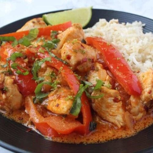 - When the curry sauce has thickened, add the chicken, bell pepper, and onion mixture to it. Stir to incorporate and let simmer for 5 minutes. Add the basil and let simmer for 2 to 3 more minutes.