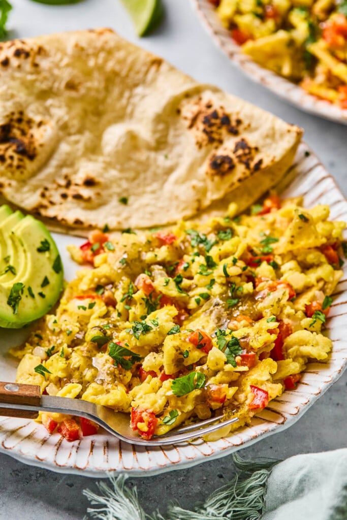 Migas are a popular Mexican and Tex-Mex breakfast dish consisting of scrambled eggs with veggies, cheese, and crispy fried corn tortillas. They can then be topped with sour cream, guacamole, diced tomato, salsa, or cilantro.