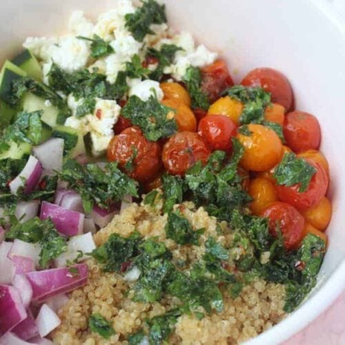 - Add cooked quinoa, cucumber, red onion, roasted tomatoes, goat cheese, salt and pepper, and dressing to a large bowl. Mix to combine.