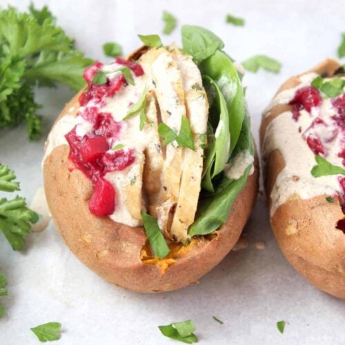 Instead of using bread, I stuffed all that into a baked sweet potato. I choose spinach, turkey, and cranberry sauce and then drizzled it with a cinnamon tahini sauce (I was never a big fan of gravy). My favorite brand of tahini is Soom – if you are looking to try it, use this link to save 10%. You can add whatever you want in there though. My rendition keeps it paleo and Whole30 approved, but go wild. If you don’t eat meat, add chickpeas instead. I’m thinking the addition of green bean casserole or stuffing and drizzled with gravy would be pretty epic. Happy leftovers my friends!