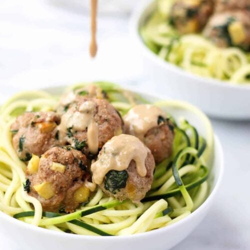 These are paired with a zucchini noodle, but you can pair with anything you like. I think sweet potato noodles with be great or just some roasted potatoes. They make for great meal prep for lunches or just an easy protein packed healthy snack. One morning I even topped them with an egg for a quick breakfast!